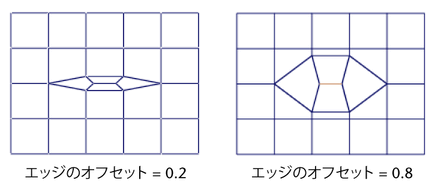 エッジのオフセット(Edge Offset) は、エッジ ループのオフセット(Offset Edge Loop)がアクションとして動作するように設定されている場合にのみ使用できます。このオプションでは、選択したエッジの隣接する両側にオフセット エッジを配置する距離を決定します。エッジのオフセット(Edge offset)の単位は、選択したエッジと両側の隣接するエッジとの間の距離に対する割合に基づいています。たとえば、エッジのオフセット(Edge offset)を 0.5 (既定値)に設定すると、選択したエッジとオリジナルの隣接する反対側のエッジの中間に、オフセットされたエッジが配置されます。