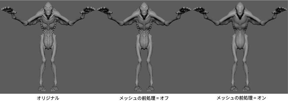 メッシュの前処理(Preprocess Mesh)では、高密度のメッシュをスムーズにすることによって最適化するため、細部が失われる可能性があります。リトポロジ化(Retopologize)を実行したときにより予測可能な結果を得るために、再メッシュ(Remesh)を実行することを推奨します。 |