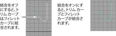 トリミングしたカーブをフィレット カーブに結合し、1 つのカーブにします。トリム(Trim)がオンの場合にのみ有効です。