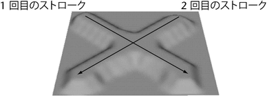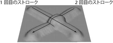 この例では、1 回目のストロークの後で、ユーザがリファレンス サーフェスを更新します。その後、2 回目のストロークが、1 回目のストロークを繰り返してそのリファレンス サーフェスに最大ディスプレイスメントを適用します。これで、リファレンス サーフェスが「ベイク処理」されます。