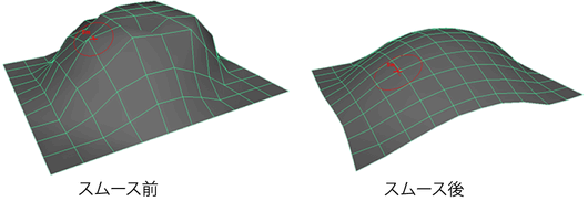 バンプの上をペイントして、そのバンプをスムーズすることができます。このスムージング操作は、ブラシ半径内のすべての起伏の位置を隣接する他のすべての起伏と平均化することにより機能します。