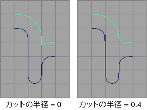 ループのカット(Loop Cutting)がオンのときは、カットの半径(Cutting Radius)の値が適用されます。カットの半径(Cutting Radius)の値が 0 より大きい場合は、ループが切り捨てられた箇所が鋭いコーナーにならず、指定の半径の円弧が作成されます。