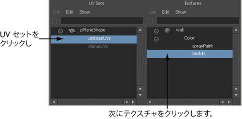 左側のカラムの UV セット(UV Set)をクリックしてから、右側のカラムのテクスチャをクリックして強調表示します。 |