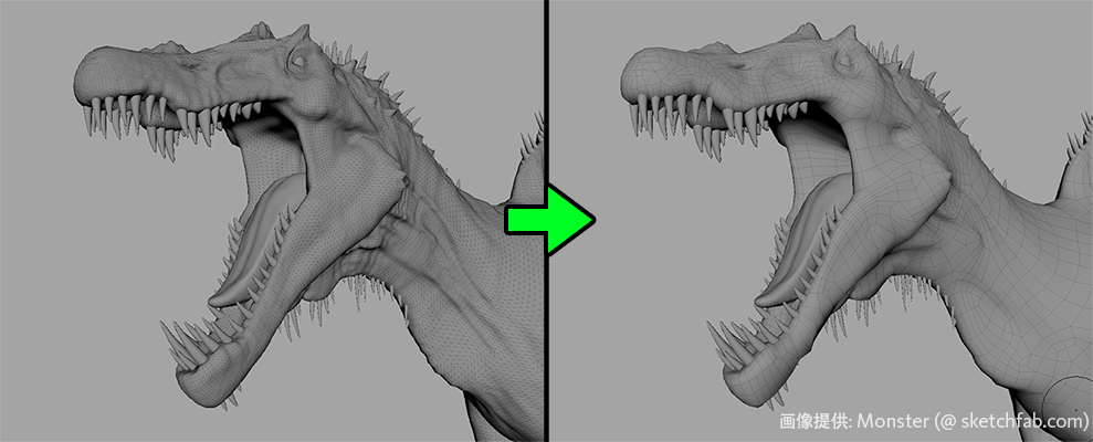 注: リトポロジ化されたメッシュの解像度(ターゲット フェース数(Target Face Count))によって、入力メッシュのシェイプとエッジ フローをどの程度まで保持するかが決定します。たとえば、ターゲット フェース数(Target Face Count)の値が小さいほど、入力メッシュの一般的なシェイプが保持され、ターゲット フェース数(Target Face Count)の値が大きいほど、入力メッシュに近いシェイプになります。