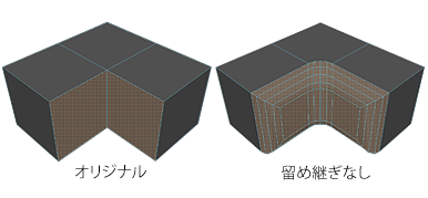 ベベルするジオメトリに基づいて、頂点ごとに最適な留め継ぎ方向が自動的に割り当てられます。この方法は頂点単位で頂点に対して実行されるため、他の利用可能なオプションとは異なる全体的な結果が得られます。