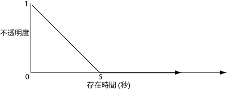 存在時間が 5 を超えると、linstep 関数は 1 を返します。不透明度は 100% 不透明のままです。次の表に、不透明度アトリビュートに代入される値の例を示します。