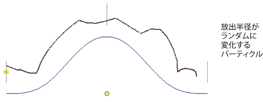 パーティクルの放出半径をランダムに変化させる度合いを設定します。放出半径が変化すると、フロー マニピュレータのロフトを越えてパーティクルが広がることがあります。このアトリビュートを使用すると、より自然なエフェクトを作成することができます。