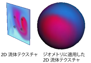 サーフェス シェーダ マテリアルに 2D 流体テクスチャをマッピングすると、サーフェス上に流体のパターンが作成されます。