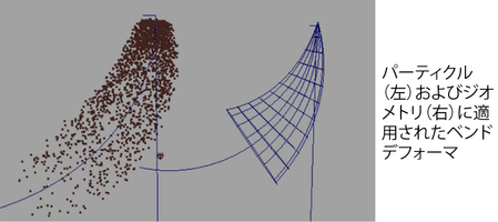 デフォーマは、ジオメトリに対してと同様に、パーティクルに作用します。また、デフォーマのレイヤ化も可能です。