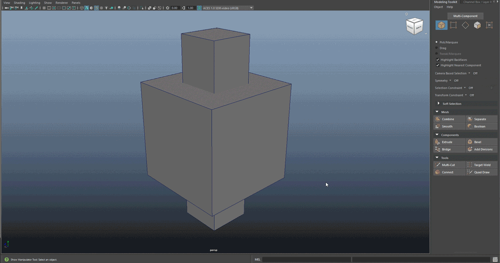 スマート押し出し(Smart Extrude)をアクティブにするには、まずビューポートでフェースのコンポーネントを選択します。次に、メッシュの編集 > スマート押し出し(Edit Mesh > Smart Extrude)を選択し、マニピュレータを使用してビューポート(Viewport)でフェースをドラッグします。オーバーラップしたフェースは、自動的にステッチされ、メッシュに再構築されてトポロジの結果がクリーンになります。