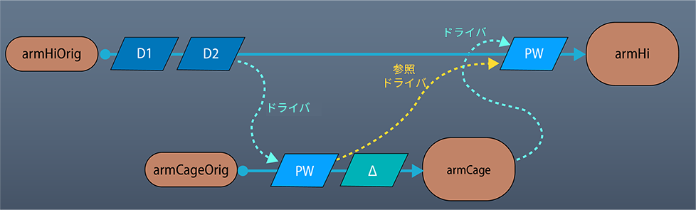 たとえば、ケージ ジオメトリが proximityWrap デフォーマを使用してハイレゾ ジオメトリによって変形されているとします。次に、ケージ ジオメトリ自体を再び使用し、proximityWrap デフォーマを使用してハイレゾ ジオメトリを変形させますが、二重の変形を回避するため、変形したケージをリファレンスとして使用します。