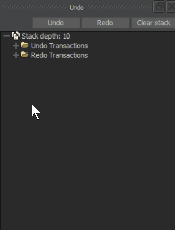 Undo ウィンドウを開きます。作業中の Undo スタックの深さ(Undo レベル)、Undo および Redo スタックの要素、スタックの操作や管理を行うボタンなど、作業中の Undo および Redo スタックの情報が表示されます。