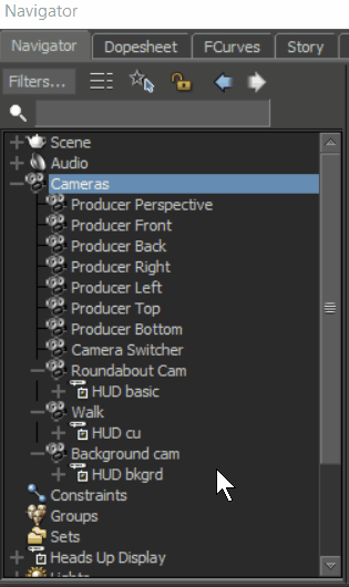 Navigator で Cameras を展開し、共有する HUD アセットがあるカメラを見つけます。HUD アセットは、Navigator の Heads Up Display フォルダにも表示されます。