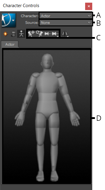 Actor Controls ウィンドウ A.Character ドロップダウン リスト B.Source ドロップダウン リスト C.エフェクタを固定するボタン D.アクター表示