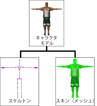 キャラクタ モデルは二足歩行(Biped)、四足歩行(Quadruped)などといった 3D モデルで、ジオメトリック スキンまたはメッシュで覆われたスケルトンで構成されます。