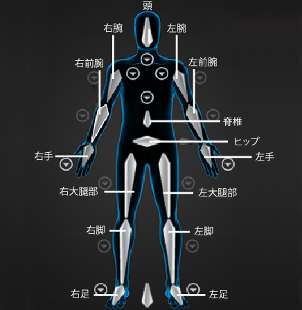 これらの必須ノードは、キャラクタのスケルトン内にある主要なジョイント(足首、膝、ヒップ、脊椎基部、肩、肘、手首、頭)を識別します。スケルトン内のどのボーンが各ノードに対応するかは、単純明快です。
