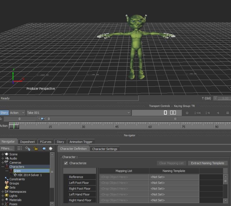 Open the GremlinGreen_NoCharacterization.fbx file in MotionBuilder and run the character_characterization.py script to see a full workflow for characterization.