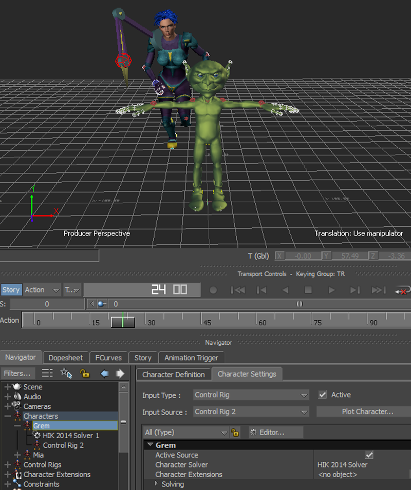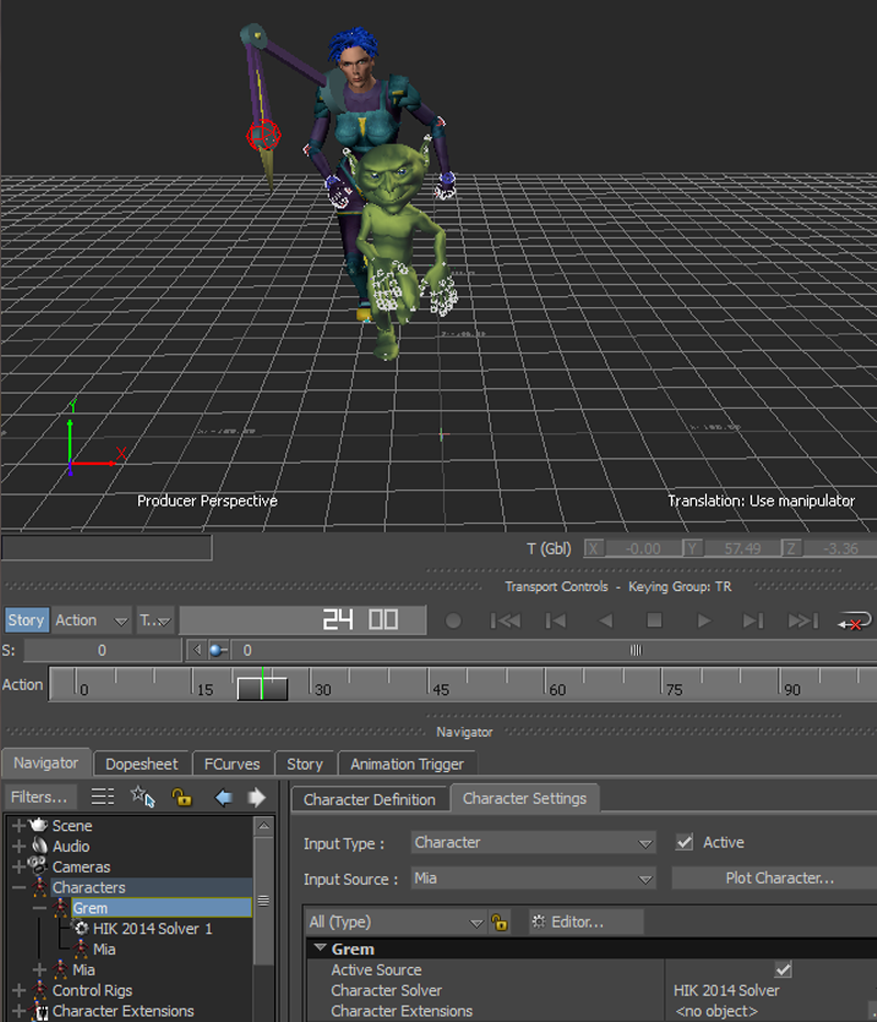 Open the GremlinGreen_AfterCharacterization_MergeMia.fbx file and run the character_create_input.py script to set the character input of grem to mia. Setting the character input drives the grem character using the animation in mia as shown in the following figure.