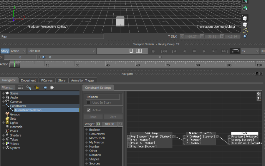 lConstraintRelation = FBConstraintRelation('AConstraintRelation') is used to create a relation constraint.lConstraintRelation.CreateFunctionBox('Sources', 'Sine Ramp') is used to create a sine ramp type function box in a relation constraint.lConstraintRelation.SetBoxPosition(lNumberToVectorBox, 400, 30) sets the box's position in the relation constraint panel.FBConnect (lSineRampOut, lNumberToVectorIn) connects the two animation nodes to make the first one drive the second one.lConstraintRelation.Active = True to set the constraint active.
