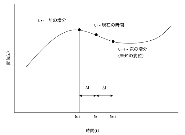 基本的な構造応答(変位)は、個別の時点(一般的には一定間隔の連続した時点)で計算されます。この解析手法は中央有限差分法と呼ばれ、後続の時点での変位、速度、加速度を調べ、それらの現在と過去の値を求めます。下の図は、過渡積分のグラフです。