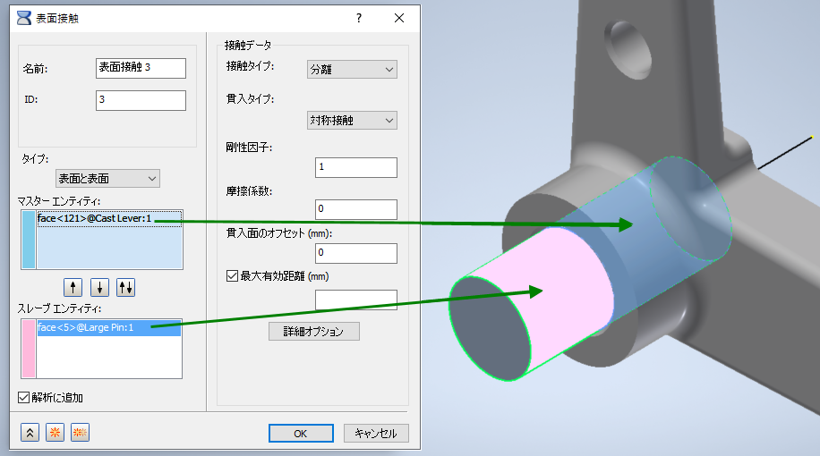 - 一般的に、[手動]オプションを選択して接触を設定する場合は、曲率が最小の接触セグメントとしてプライマリ表面を選択するか、円柱面の接触であれば外側のセグメントとしてプライマリ表面を選択(および非対称の貫通を使用)します。