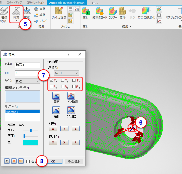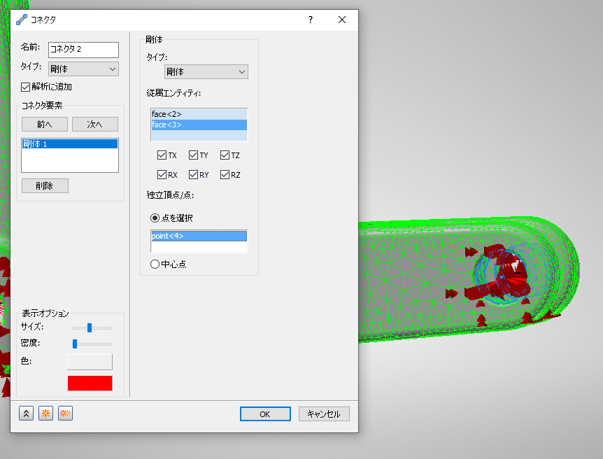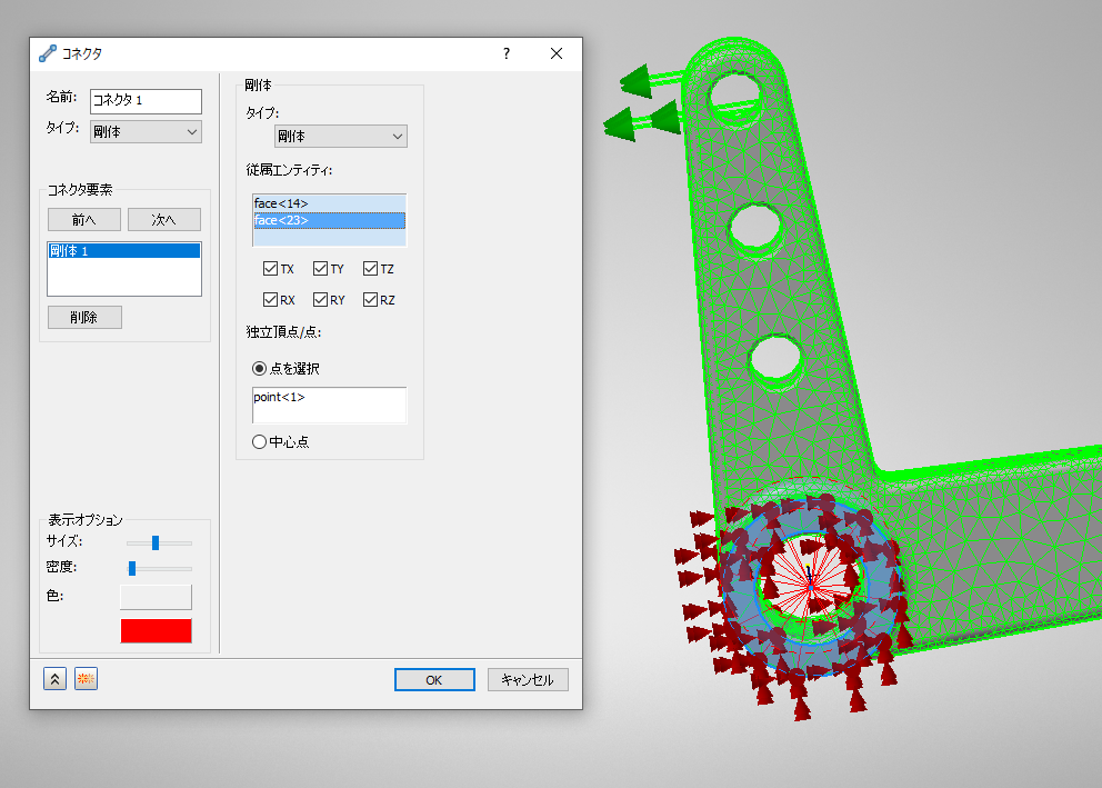 FEA でよく使用される手法は、回転をコントロールするための「ボール ジョイント」拘束です。ボール ジョイント拘束では、剛体要素を使用して基準点をコントロールします。通常、剛体要素はその外観から「スポーク」または「蜘蛛の巣」と呼ばれます。エッジやサーフェスの動きを基準点に結び付けることで、より自然な動きにすることができます。Autodesk Inventor Nastran では、次のように、これを剛体コネクタで行います。