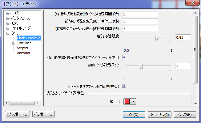 [[切替をアニメーション表示]の継続時間]ボックスに、必要な値を入力します。[Clash Detective]ウィンドウの結果グリッド内のクラッシュをクリックした場合、この値によって、現在のビューから次のビューへの遷移がスムーズに行えるようになります。