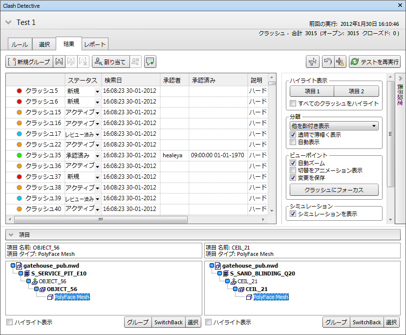 [切替をアニメーション表示]: このオプションをオンにすると、[結果]グリッドでクラッシュを選択したときに、[シーン ビュー]のクラッシュ ポイント間の遷移がアニメーション表示されます。このチェック ボックスをオフにすると、メインのビューポイントを静止状態にしたまま、クラッシュを 1 つずつ確認できます。既定では、このチェックボックスはオフになっています。ヒント: この効果を利用するには、ビューポイントの[自動更新]または[自動ロード]オプションを選択する必要があります。