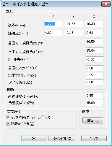 2D または 3D ワークスペースのどちらで作業しているかによって、カメラの位置、視野、移動速度、保存属性などのビューポイントの属性を編集することができます。すべてのエントリは、表示単位で測定されます。