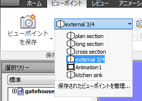 [ビューポイント]タブ > [保存、ロード、再生]パネル > [保存されたビューポイント]ドロップダウンの順にクリックし、レビューするビューポイントを選択します。