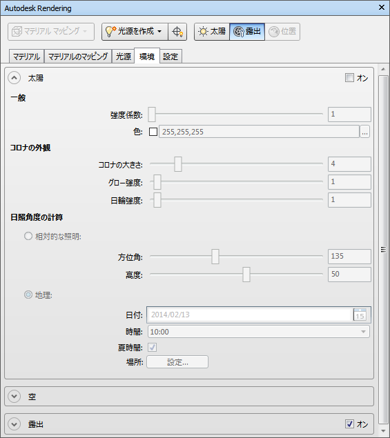 太陽と空のプロパティ、および露出の設定を指定するには、[環境]タブを使用します。