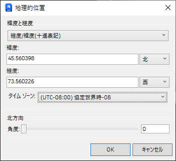 このダイアログ ボックスでは、モデル内の地理的位置の緯度、経度、および北方向を設定します。[シーン ビュー]は、カスタマイズした時間帯におけるカスタマイズした太陽の位置を表示します。