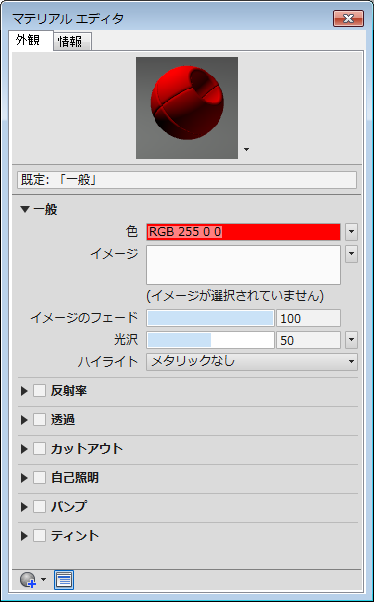 [マテリアル エディタ]の構成は、選択したマテリアルの種類によって変わります。