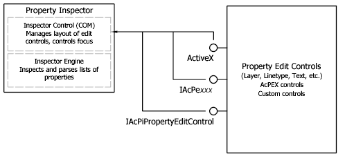 Property Edit controls are independent ActiveX modules that do not reside in the Property Inspector module. For each property it presents, the Inspector Engine loads either a standard ActiveX control, a stock control from the acPEXCtl16.tlb file, or a custom control from an external application. See Adding ActiveX Editing Controls to the Property Inspector for information on how to provide a custom control.