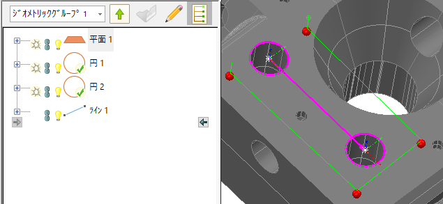[ホーム]タブ > [プローブパス]パネル > [表示]矢印 > [選択プローブパス表示]をクリックし、シーケンス ツリーで現在選択されているアイテムのプローブ パスを表示します。例: