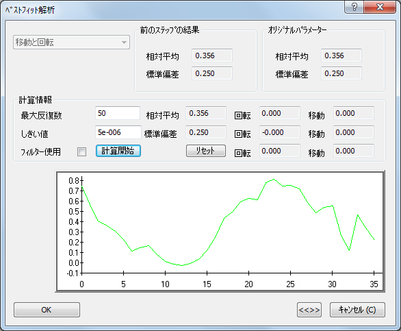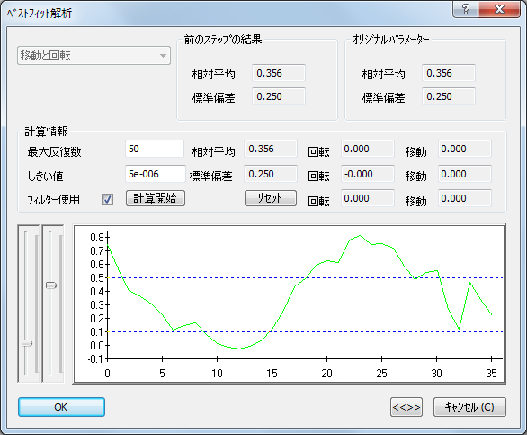 [ベストフィット解析]ダイアログを使用して、ベストフィット計算の実行、および結果の確認を行います。