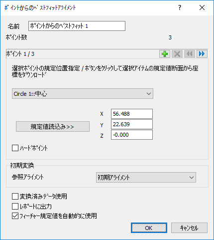 既定で、ポイントの規定座標が、XYZ に表示されます。各ポイントの規定値を手動入力するには、フィーチャー規定値を自動的に使用 を選択解除し、座標を入力します。