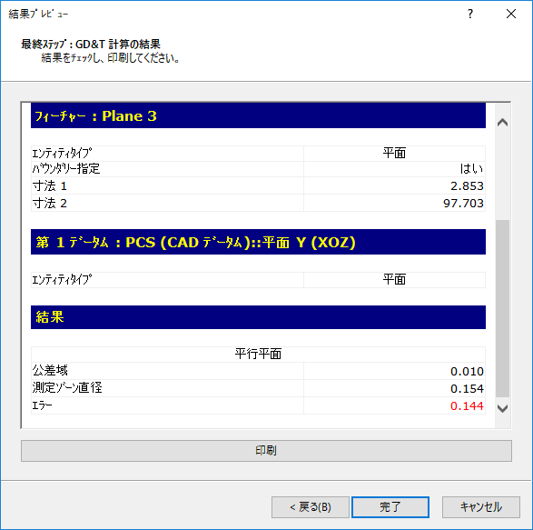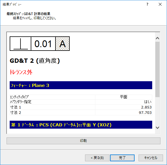 マウスをスクロールし、使用されたデータム、公差域、エラー値に関する情報を表示します。例: