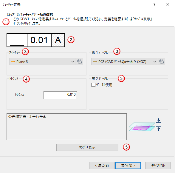 4. 次へ をクリックし、既定角度トレランスを了解します。フィーチャー定義 ダイアログが表示されます。例: