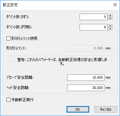7. 既定で PowerInspect は、プローブを自動較正します。較正ポイントの配置を制御する場合、手動較正実行 を選択します。