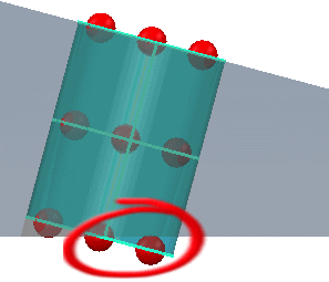 この例では、選択された円筒が、底部サーフェスに向かって角度付けされています。また、プローブパスの一部のポイントが、パーツと接触していません。