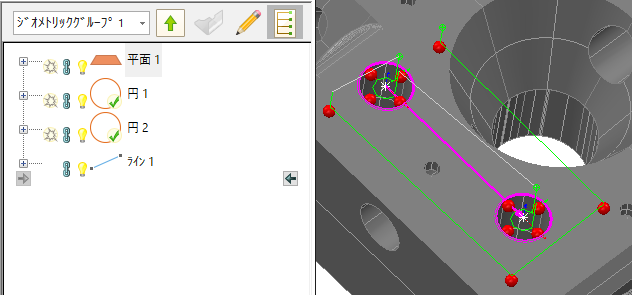 [ホーム]タブ > [プローブパス]パネル > [表示]矢印 > [全て表示]をクリックし、検査シーケンスまたは任意の範囲内の全アイテムのプローブ パスを表示します。例: