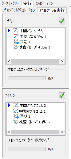 検査シーケンスを実行すると、コラム 2 が追付くまで、コラム 1 が一時停止になります。[メッセージ表示]チェックボックスを選択した場合は、[コメント]がメッセージボックスに表示されます。検査を再開するには[継続]をクリックする必要があります。[メッセージ表示]チェックボックスを選択解除した場合は、コラム 2 が同期アイテムに達すると、コラム 1 が検査を再開します。