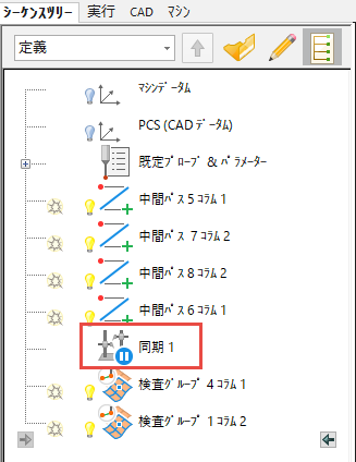 たとえば、次図の検査シーケンスでは、同期アイテムにより、コラムが検査グループの測定を続行する前に、PowerInspect がそれ以前の全アイテムの測定を完了するように設定されています。