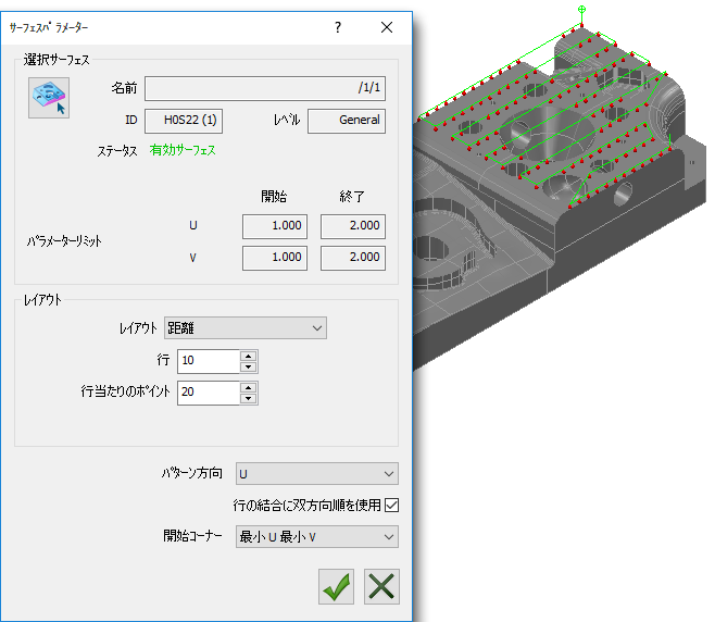 サーフェスパラメーター ダイアログの 距離 オプションは、パスを指定サーフェスに制限できる点を除き、Raster 測定方法に類似しています。距離オプションを使用してプローブパスを作成するには、行、および、行当たりのポイント 数を入力します。PowerInspect は、サーフェスの U 方向と V 方向に、行とプローブ ポイントが等間隔で配置されたパスを作成します。例: