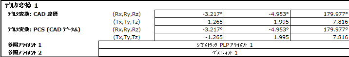 デルタ変換アイテムを使用し、任意に選択された 2 つのアライメント、または、ベストフィット間の移動と回転の差異を測定します。