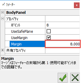 ライン、長孔、角孔などのフィーチャーでは、UseMargin パラメーターが、フィーチャーのバウンダリーと測定ポイントのロケーション間の Margin を指定します。マージンを変更する場合、ボックスをクリックし、現在の値を上書きします。
