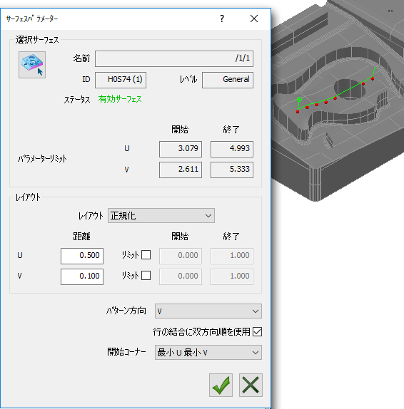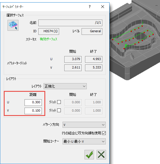 プローブパスのステップオーバー、および、ピッチ距離を制御するボックスは、選択サーフェスの U 方向と V 方向により異なります。次図の例では、パラメーターオプションと同様に、U が行間のステップオーバー距離、V がポイント間のピッチ距離になります。