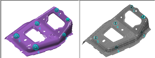 点群選択ポイントアライメントでは、1 つ以上の点群で選択された領域に CAD 上のターゲットポイントを一致させて、CAD モデルにパーツをアラインします。ターゲットポイントが 6 つの自由度を固定できるように、点群は 3 つ以上のパーツフェースをカバーしている必要があります。