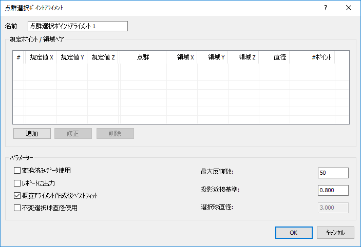- [アライメントデータム]タブ > [アライメント]パネル > [点群選択ポイント]をクリックします。点群選択ポイントアライメント ダイアログが表示されます。